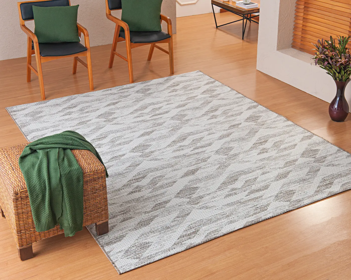 Sua composição equilibrada de polipropileno, algodão e poliéster garante resistência, durabilidade e um toque agradável ao caminhar. Para maior praticidade no dia a dia, conta ainda com aplicação de feltro antiderrapante, proporcionando mais segurança e estabilidade.