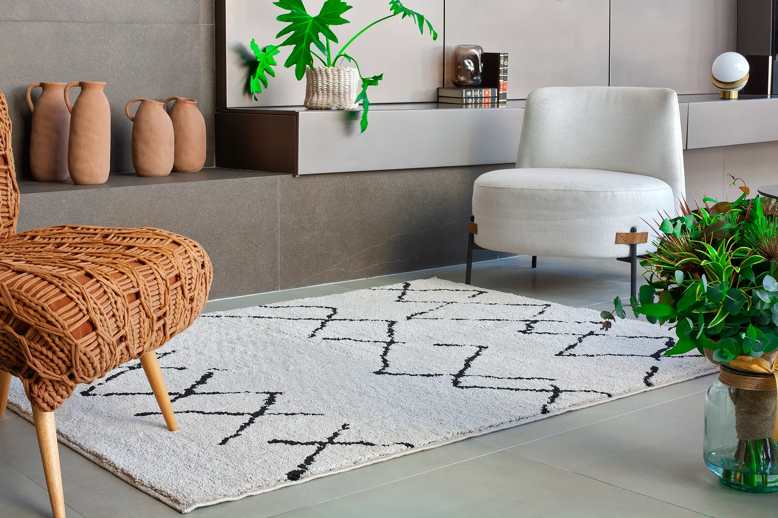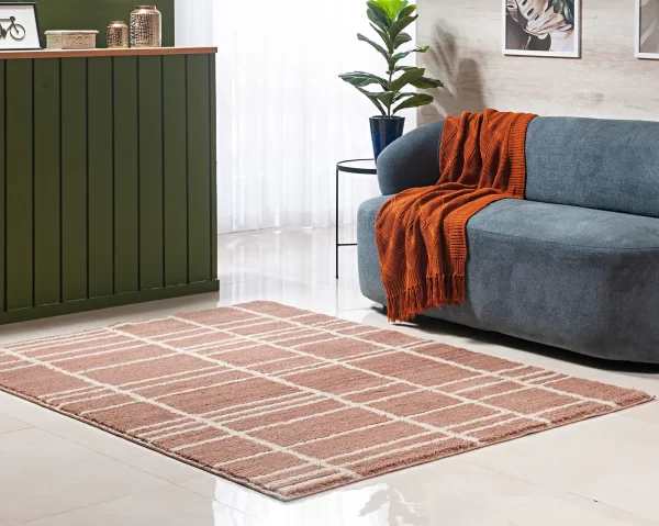 Tapete em poliéster, com textura de pelo baixo, altura de 12 mm e antiderrapante. Disponível em diversos desenhos e cores. Toque macio, com aspecto de lã.