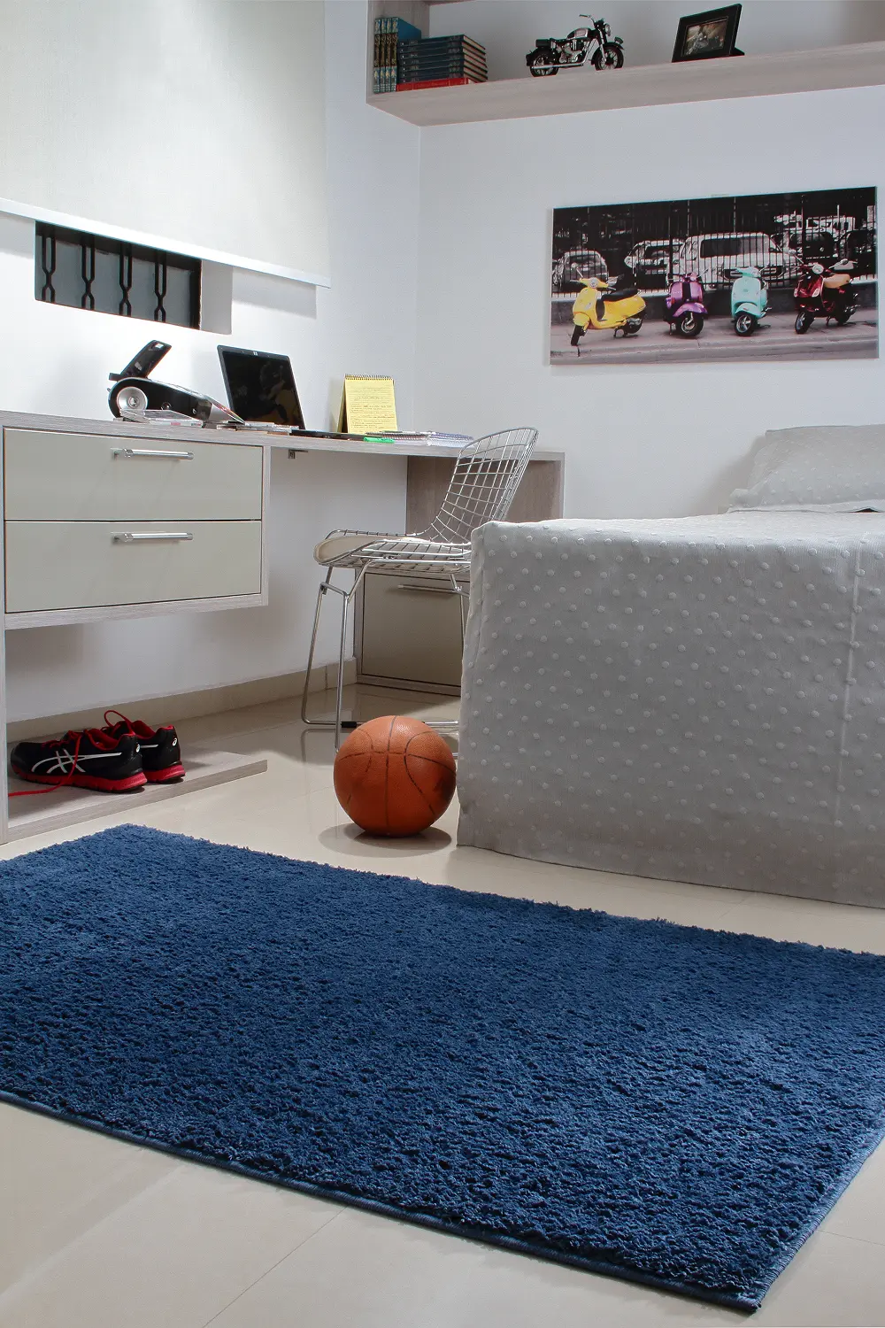 Tapete em poliéster, com textura shaggy jacquard, altura de 17 mm e antiderrapante. Modelos lisos, com opções em diversas cores e toque macio.