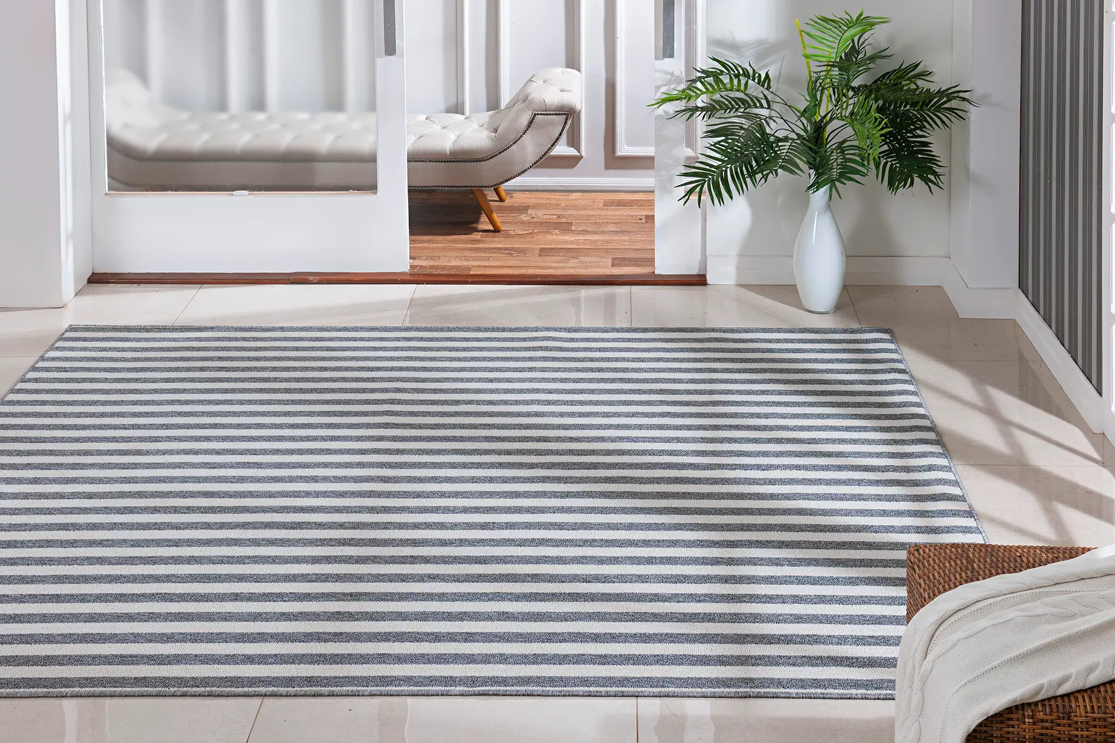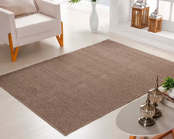 Tapete em polipropileno, com textura boucle e antiderrapante. Disponível em versões lisas e listradas.