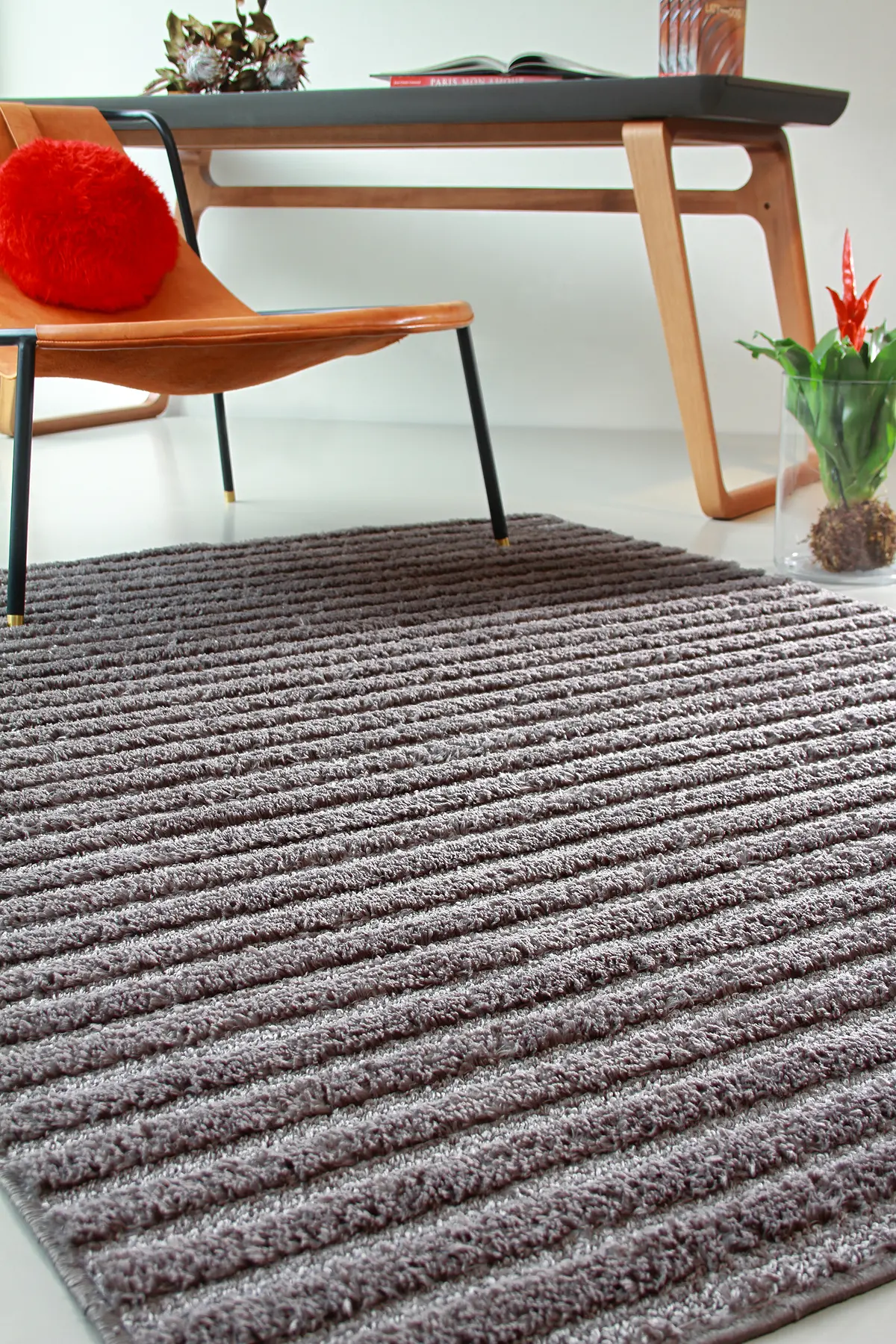 Tapete em poliéster, com textura de alto e baixo relevo, altura de 17 mm e antiderrapante. Disponível em diversos desenhos e cores. Toque macio.